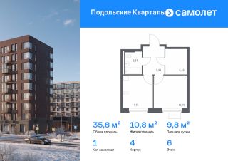 Строим кварталы для жизни с заботой о будущем. Предлагается 1-комнатная квартира комфорт-класса 35,83 кв.м в корпусе 4 на 6 этаже, в ЖК "Подольские Кварталы"