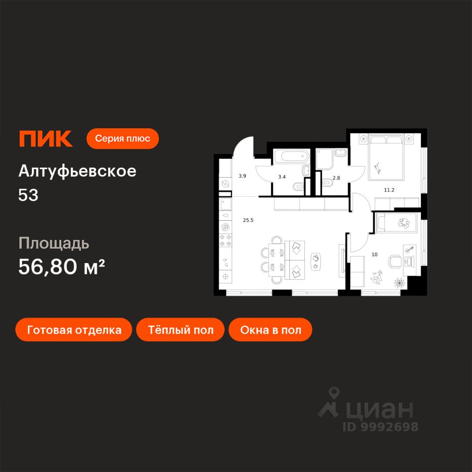 Продаётся 2-комн. квартира площадью 56,8 кв.м на 21 этаже 22 этажного дома (Корпус 1.1, Секция 1) проекта ПИК Алтуфьевское 53. Светлый просторный подъезд на уровне земли, функциональная планировка, большие окна, c отделкой.