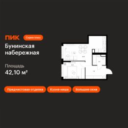 Продаётся 1-комн. квартира площадью 42,1 кв.м на 15 этаже 16 этажного дома (Корпус 2.6/1.2, Секция 2) проекта ПИК Бунинская набережная. Светлый просторный подъезд на уровне земли, функциональная планировка, большие окна, предчистовая отделка.