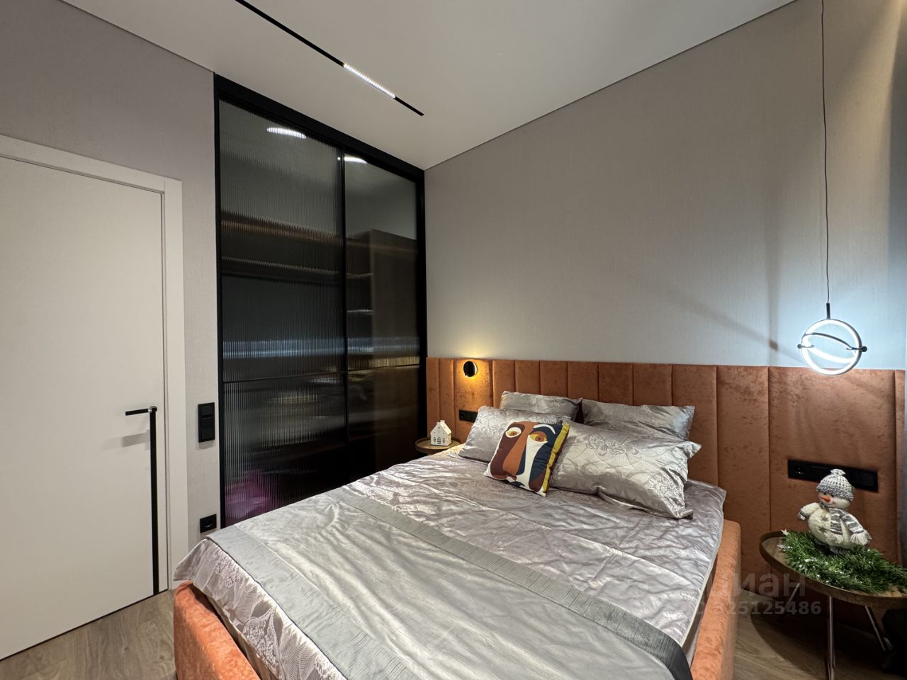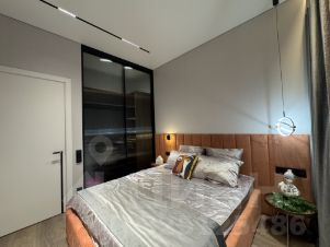 Спальня с двуспальной кроватью (подъемный механизм, емкости для белья), прикроватными столиками, широким окном и гардеробной. Напротив кровати можно повесить ТВ.