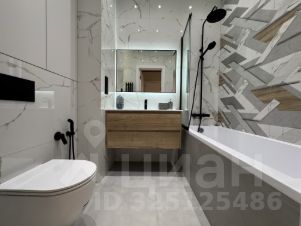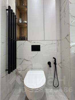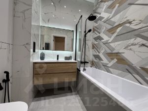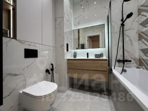 Ванная комната с полноценной лежачей ванной, тропическим и обычным душем, зеркалом с контурной подсветкой, встроенным шкафом для химии и мелочей и современной инсталляцией с гигиеническим душем.