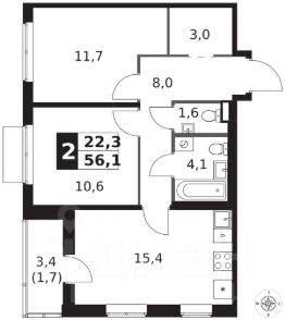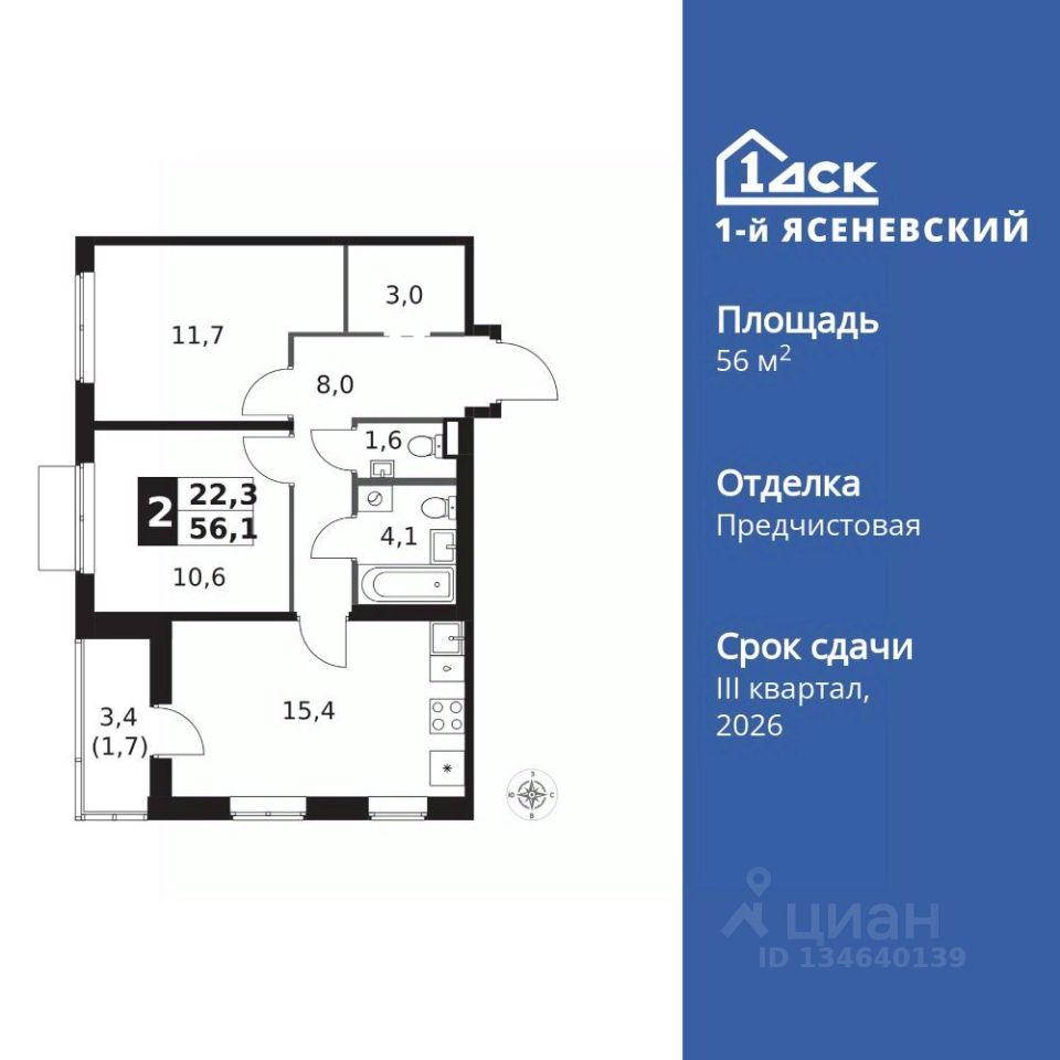 Продаётся 2-к квартира номер 646 общей площадью 56.1 кв.м. на 5-м этаже 18 этажного здания. Отделка Whitebox. Цена с учётом скидки.