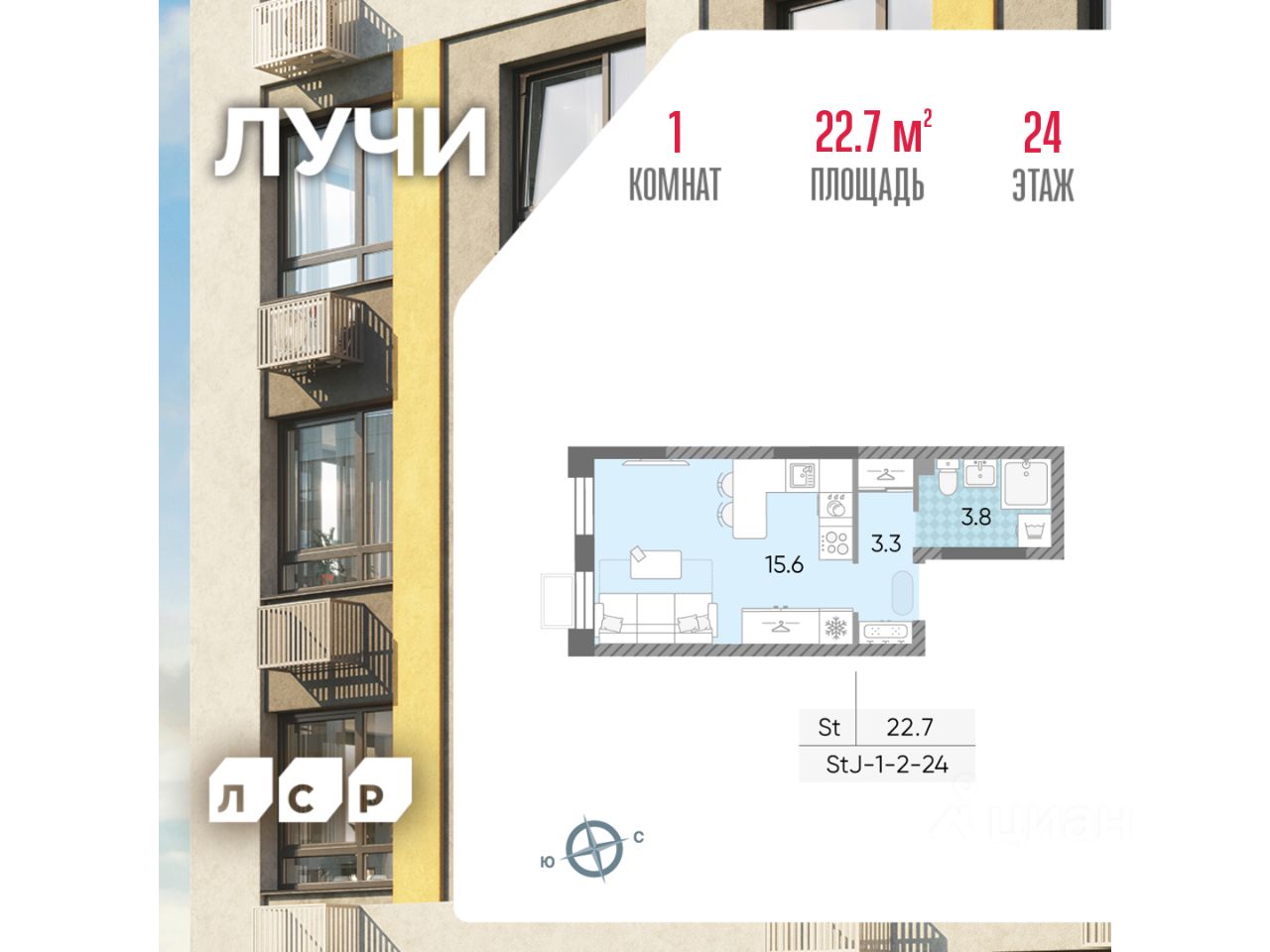Продается студия общей площадью 22.7 кв. метров на 24 этаже жилого комплекса Лучи.