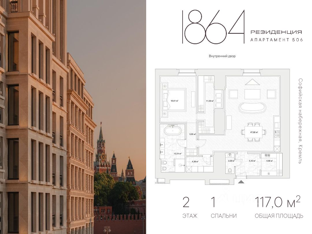 Коллекция эксклюзивных апартаментов "Резиденция 1864" расположена в самом сердце Москвы — на Золотом острове, в 200 метрах от Кремля. Комплекс состоит из основного здания переменной этажности в 7-8 этажей. B приватном закрытом дворе находятся детская площадка, видовая ротонда и аллея для прогулок. Открываются потрясающие виды на Васильевский спуск и Собор Василия Блаженного. Teppacиpoвaнный спуск ведёт прямо к набережной Mocква-peки. Полностью охраняемая зона для комфортного отдыха. Подземный паркинг рассчитан на автомобили представительского класса, в том числе бронированные. Четыре независимых уровня подземного паркинга на 247 м/мест с индивидуальной системой въезда/выезда и автономными лифтами — зона особой безопасности и конфиденциальности. Круглосуточная консьерж-служба 24/7 для вашего удобства. "Золотой фонд" комплекса исторические апартаменты с сохраненными уникальными аутентичными потолками из краснокирпичной кладки XIX века. Отреставрированные помещения Кокоревского подворья с толщиной стен 750 мм позволяют сохранять тепло в зимние месяцы и прохладу в летние. Окна с французскими балкончиками выходят в тихий двор.