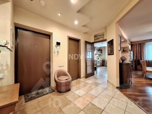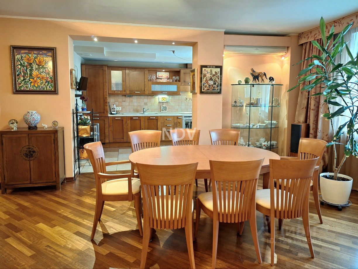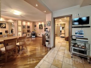 Встроенная кухня (Италия) с встроенной техникой Бош (посудомоечная, варочная панель, духовой шкаф, холодильник), утеплённая лоджия с зимним садом, функционально: кухня-столовая, гостиная-домашний кинотеатр с шикарной акустической системой, спальня с гардеробной комнатой, рабочий кабинет/детская , библиотека, три санузла, 2 кладовые комнаты с системами хранения, просторная прихожая с встроенным шкафом-купе.