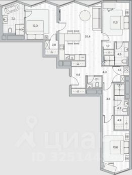 Функциональная планировка квартиры: кухня-гостиная 26.4 метра, спальня 12 кв.м с ванной комнатой и гардеробной, мастер-спальня 11,5 кв.м, хозяйственная комната, гостевой санузел, прихожая, мастер-спальня 10.5 кв.м. Всего в квартире 5 окон, выходят на обе стороны.