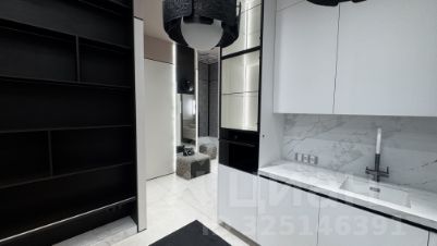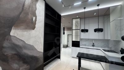 Вся мебель сделана на заказ по дизайнерскому проекту и остаётся покупателю: современная кухня с кварцевой столешницей и фартуком, удобные системы хранения, эффектный стеллаж в гостиной с раздвижной панелью под телевизор, спальня с мягким изголовьем, встроенными шкафами и рабочим местом.