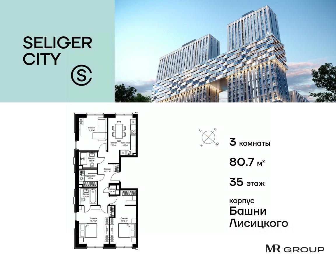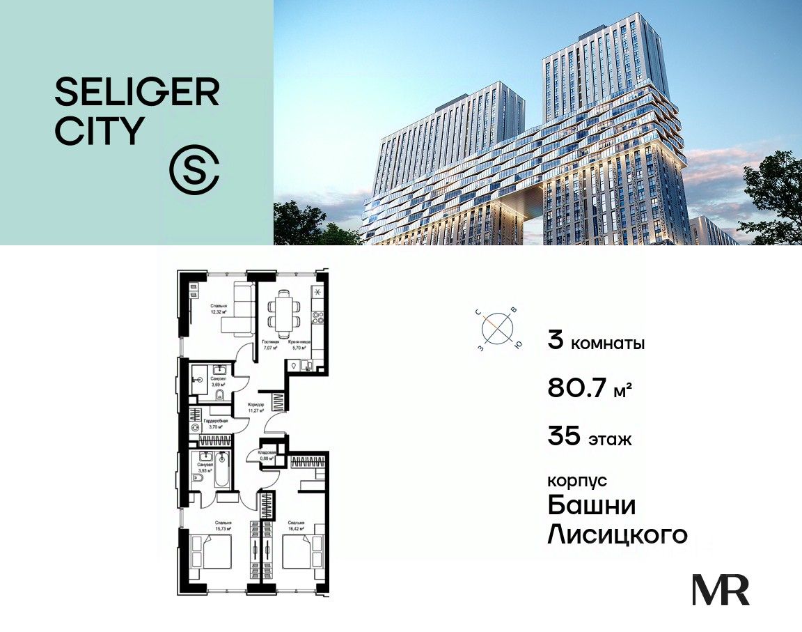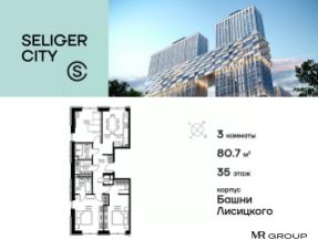 Продаётся 3-комнатная квартира общей площадью 80.71 м² с предчистовой отделкой в ЖК "Селигер Сити" на 35-м этаже башни Лисицкого.
