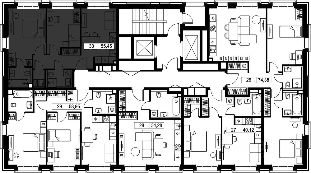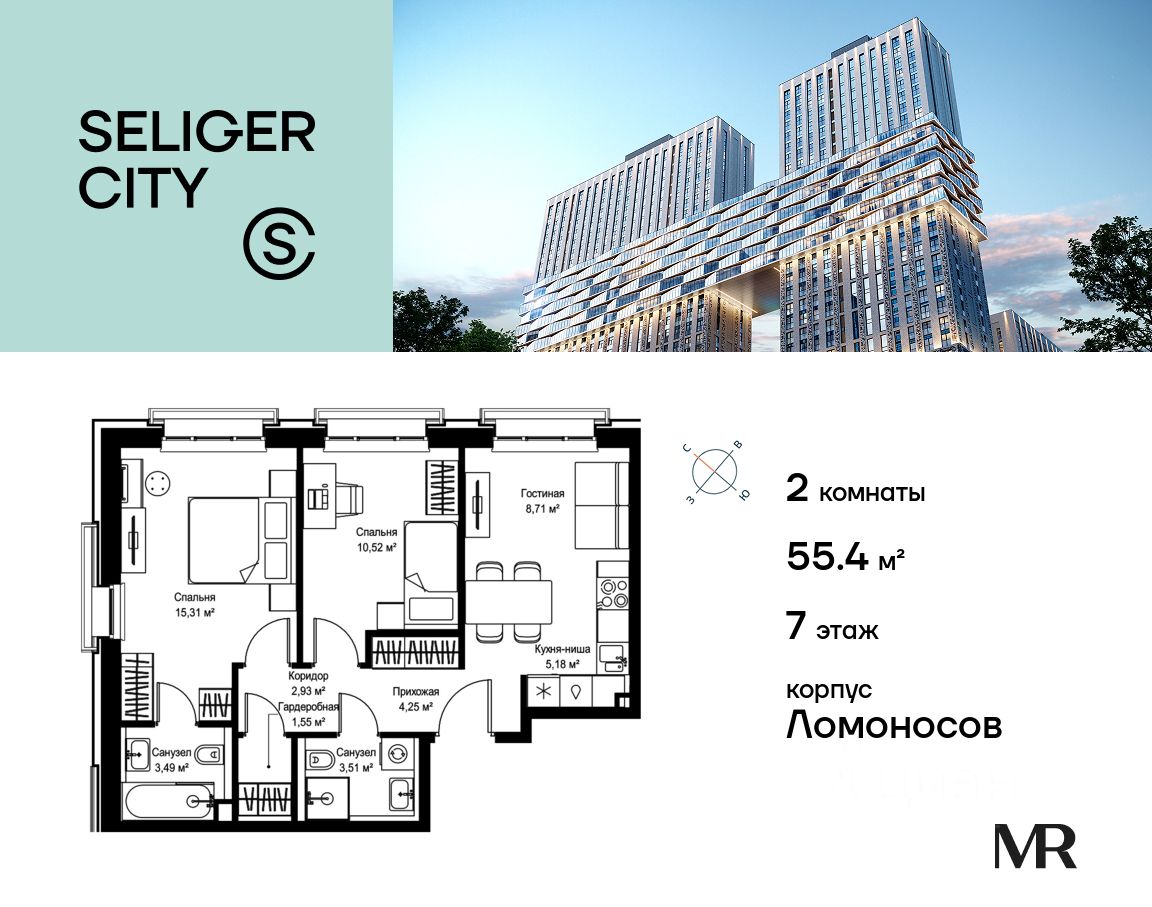 Продаётся 2-комнатная квартира общей площадью 55.45 м² без отделки в ЖК "Селигер Сити" на 7-м этаже корпуса Ломоносов.