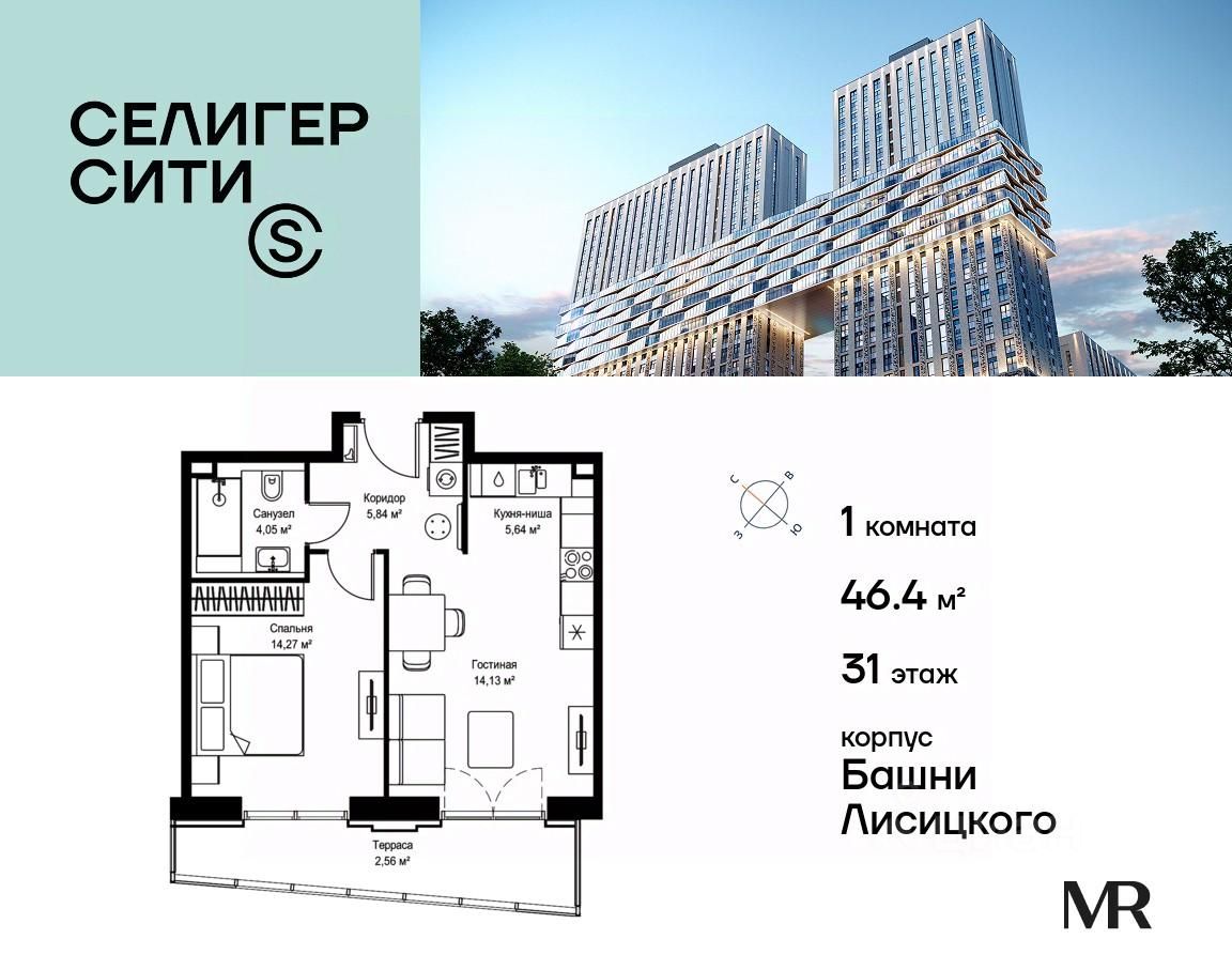 Продаётся 1-комнатная квартира общей площадью 46.49 м² без отделки в ЖК "Селигер Сити" на 31-м этаже башни Лисицкого.