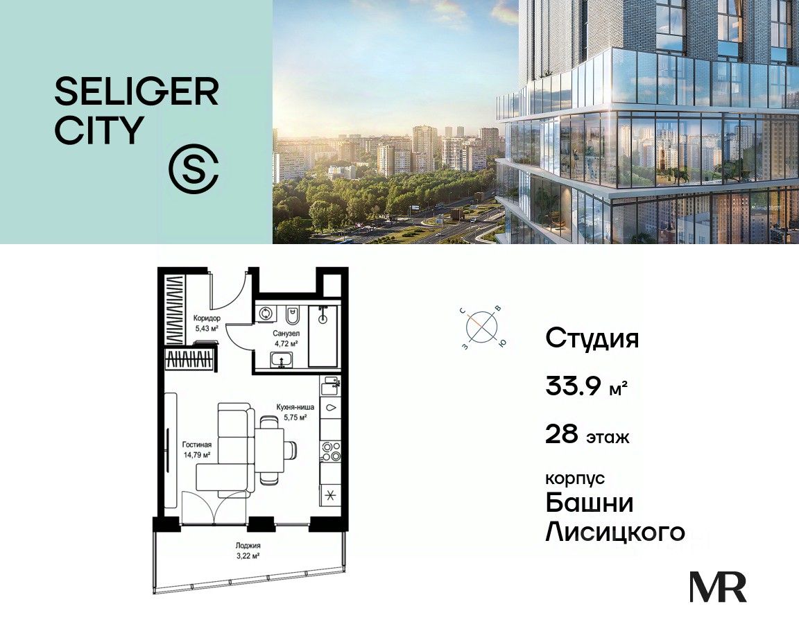 Продаётся студия общей площадью 33.91 м² без отделки в ЖК "Селигер Сити" на 28-м этаже башни Лисицкого.