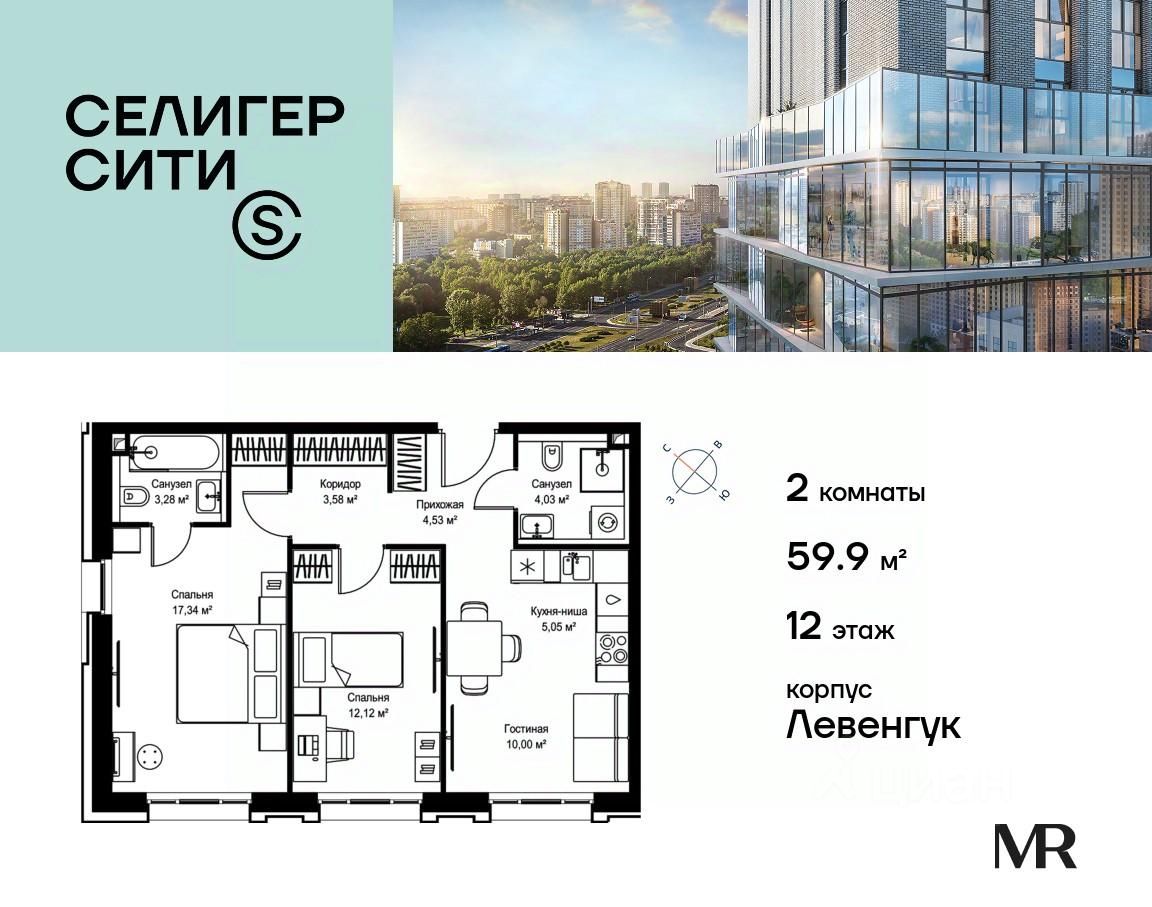Продаётся 2-комнатная квартира общей площадью 59.93 м² без отделки в ЖК "Селигер Сити" на 12-м этаже 21 этажного дома.