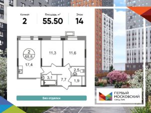 Общая площадь квартиры - 55,5 кв. м, этаж 14 из 19.