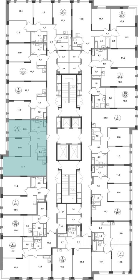 Общая площадь квартиры - 61,3 кв. м, этаж 19 из 19.