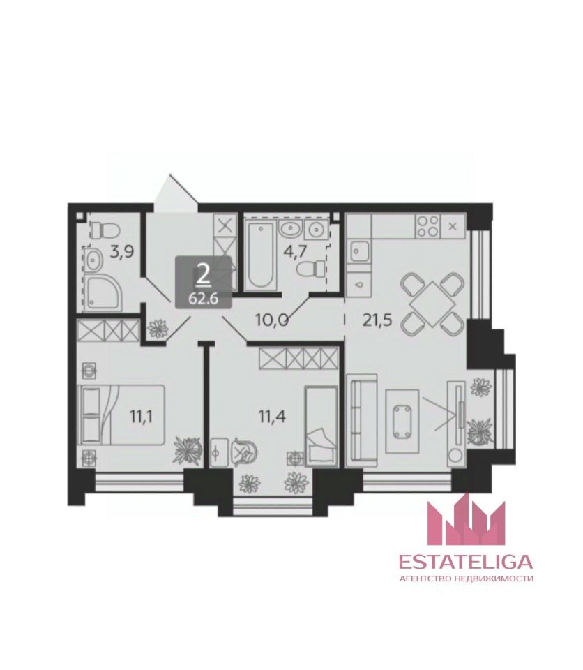 Кухня-гостиная, 2 спальни, 2 санузла, гардероб.