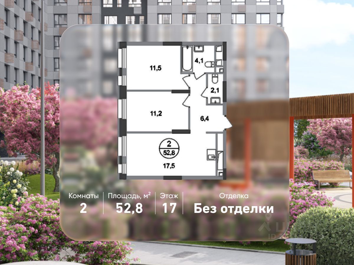 Общая площадь квартиры - 52,8 кв. м, этаж 17 из 20.