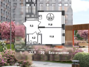 Общая площадь квартиры - 32,9 кв. м, этаж 20 из 20.
