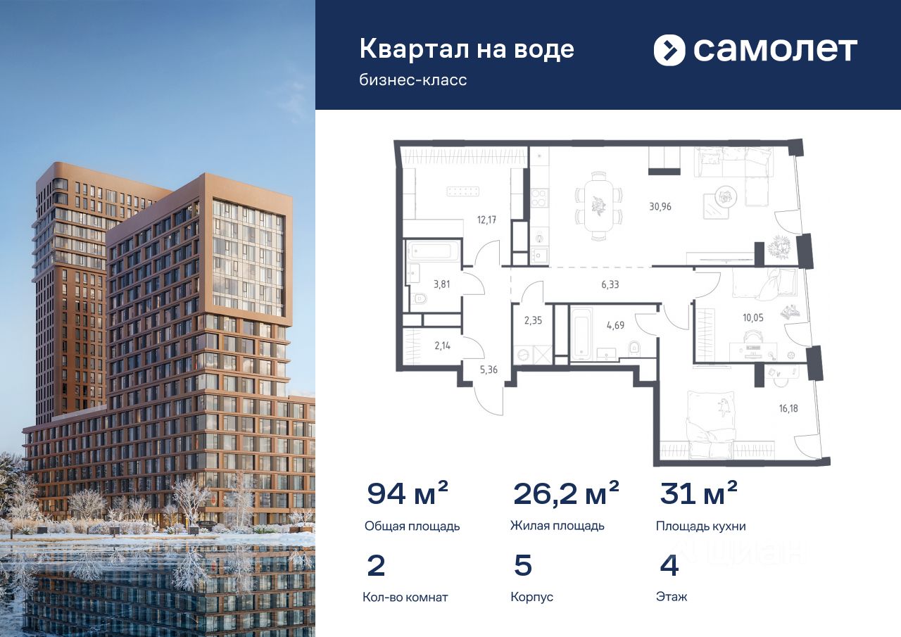Строим кварталы для жизни с заботой о будущем. Предлагается 2-комнатная квартира бизнес-класса 94,04 кв.м в корпусе 5 на 4 этаже, в ЖК "Квартал на воде"