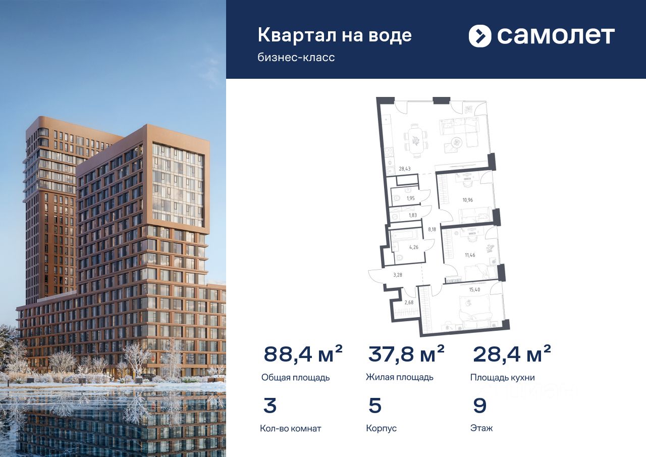 Строим кварталы для жизни с заботой о будущем. Предлагается 3-комнатная квартира бизнес-класса 88,43 кв.м в корпусе 5 на 9 этаже, в ЖК "Квартал на воде"