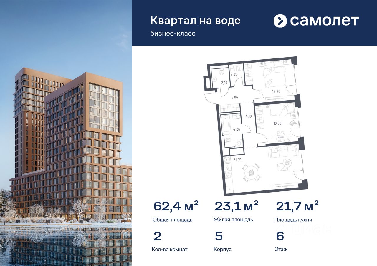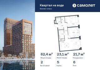 Строим кварталы для жизни с заботой о будущем. Предлагается 2-комнатная квартира бизнес-класса 62,37 кв.м в корпусе 5 на 6 этаже, в ЖК "Квартал на воде"