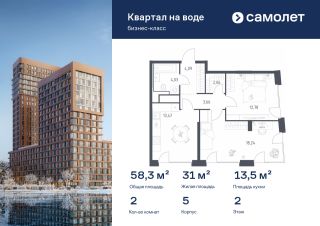 Строим кварталы для жизни с заботой о будущем. Предлагается 2-комнатная квартира бизнес-класса 58,33 кв.м в корпусе 5 на 2 этаже, в ЖК "Квартал на воде"