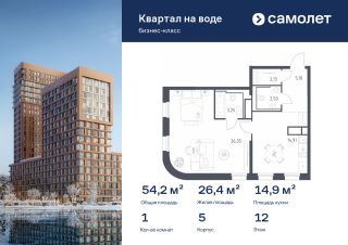 Строим кварталы для жизни с заботой о будущем. Предлагается 1-комнатная квартира бизнес-класса 54,24 кв.м в корпусе 5 на 12 этаже, в ЖК "Квартал на воде"