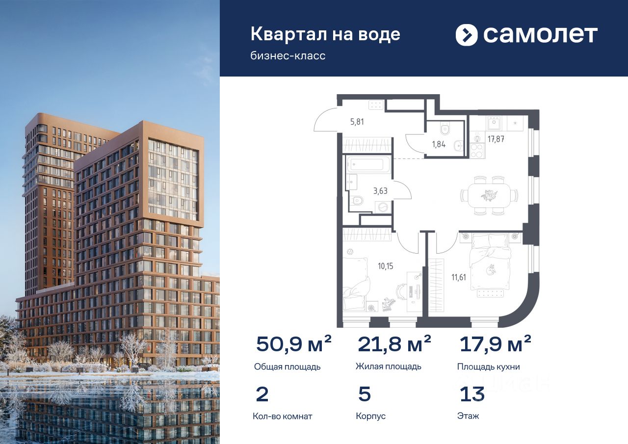 Строим кварталы для жизни с заботой о будущем. Предлагается 2-комнатная квартира бизнес-класса 50,91 кв.м в корпусе 5 на 13 этаже, в ЖК "Квартал на воде"