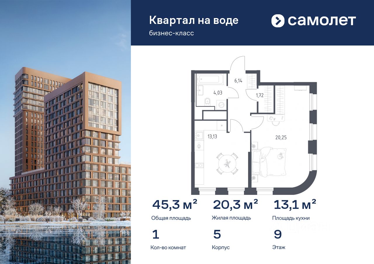 Строим кварталы для жизни с заботой о будущем. Предлагается 1-комнатная квартира бизнес-класса 45,27 кв.м в корпусе 5 на 9 этаже, в ЖК "Квартал на воде"