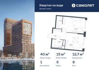 Строим кварталы для жизни с заботой о будущем. Предлагается 1-комнатная квартира бизнес-класса 39,97 кв.м в корпусе 5 на 8 этаже, в ЖК "Квартал на воде"