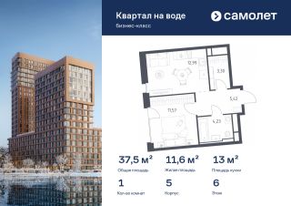 Строим кварталы для жизни с заботой о будущем. Предлагается 1-комнатная квартира бизнес-класса 37,51 кв.м в корпусе 5 на 6 этаже, в ЖК "Квартал на воде"