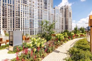Прекрасные общественные пространства: собственный ландшафтный двор на площади 1,7 га, скрытый от шума улиц благодаря оригинальному решению, превратился в живописную долину. Территория двора разделена на зоны для активного и тихого отдыха. Зоны активного отдыха: места для пикника, детская площадка, универсальная спортивная площадка и зона workout. Зоны тихого отдыха: уютный пруд с лавочками, тихие обособленные зоны для отдыха, беседки, 5 пеших маршрутов для променада, уникальная общественная гостиная с открытой террасой и гамаками.