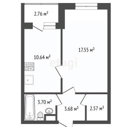 Просторная площадь: Общая площадь 38.1 м² грамотно распределена: жилая зона 17.6 м², а кухня впечатляющих размеров — 10.6 м²! Это редкость для однокомнатных планировок.