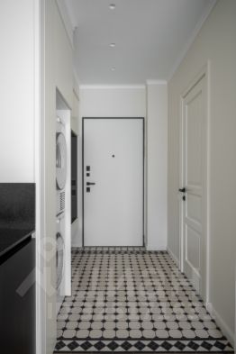 Прихожая продумана до мелочей: встроенная система хранения, в которой скрыты не нарушающие эстетики стиральная и сушильная машины Asko.