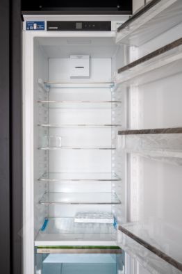 Встроенный в нишу холодильник и дополнительно встроенная в кухню морозильная камера — создают максимум хранения, функциональности и сохранения общего пространства.