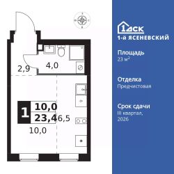 Продаётся квартира-студия номер 611 общей площадью 23.4 кв.м. на 2-м этаже 18 этажного здания. Отделка Whitebox.