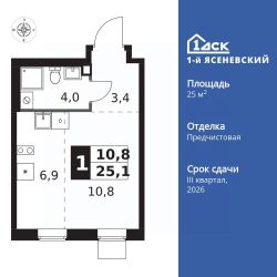 Продаётся квартира-студия номер 621 общей площадью 25.1 кв.м. на 3-м этаже 18 этажного здания. Отделка Whitebox.