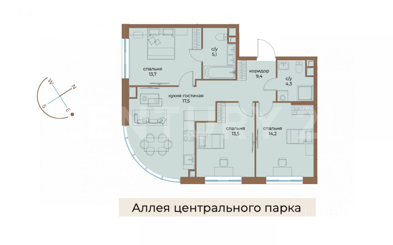 Планировка: 3 отдельные спальни, 2 санузла, просторная кухня-гостиная с панорамным окном, гардеробная.