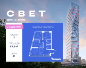 Продаётся 3-к квартира 69.8 кв.м. на 27-м этаже 51 этажного дома.