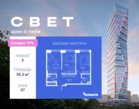 Продаётся 2-к квартира 56.2 кв.м. на 27-м этаже 51 этажного дома.