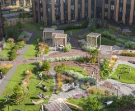 В комплексе — современные входные группы и общественные зоны: светлые лобби, колясочные, комната для питомцев. Закрытые дворы с благоустройством и зонами отдыха. На первых этажах — коммерческие помещения под сервисы у дома (магазины, пекарня, аптека и т.п.).