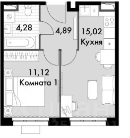 Планировка: комната 11,12 м², кухня 15,02 м², санузел 4,28 м², прихожая 4,89 м².