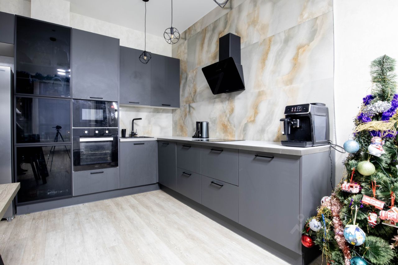 Планировка включает в себя: просторную кухню-гостиную, мастер-спальню, детскую комнату, два санузла и гардеробную.