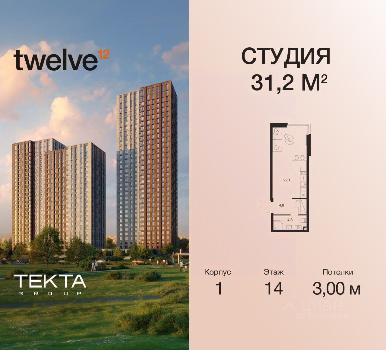 1-комн. квартира-студия в ЖК "Twelve" на 14 этаже в 34 этажном здании Корпус 1. Общая площадь: 31.2 кв.м., жилая: 14.20 кв.м. Высота потолков 3.00 м.