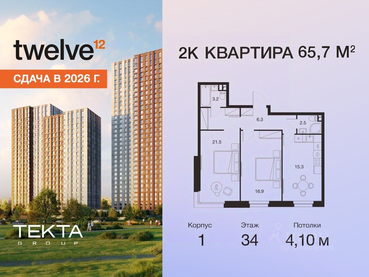 2-комн. квартира в ЖК "Твелв" на 34 этаже в 34 этажном здании Корпус 1. Общая площадь: 65.7 кв.м., жилая: 38.40 кв.м. Высота потолков 4.10 м.