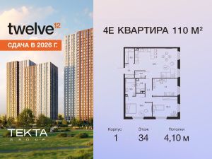 4-комн. квартира в ЖК "Твелв" на 34 этаже в 34 этажном здании Корпус 1. Общая площадь: 110 кв.м., жилая: 76.00 кв.м. Высота потолков 4.10 м.