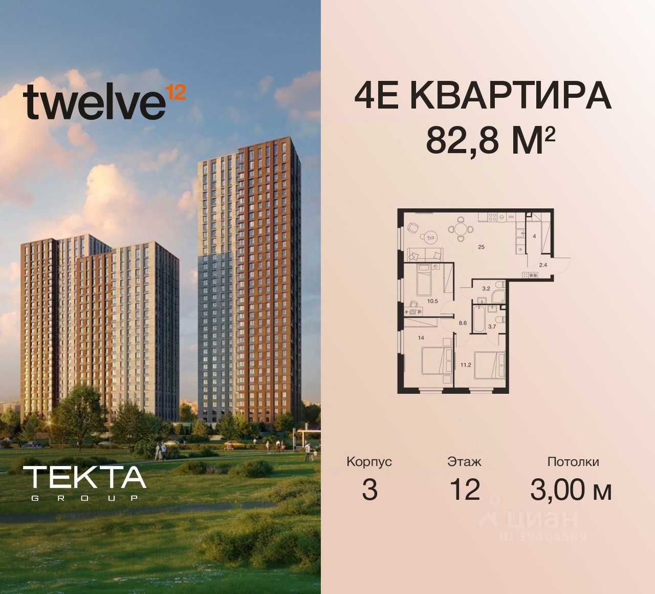 4-комн. квартира в ЖК "Twelve" на 12 этаже в 28 этажном здании Корпус 3. Общая площадь: 82.8 кв.м., жилая: 53.30 кв.м. Высота потолков 3.00 м.