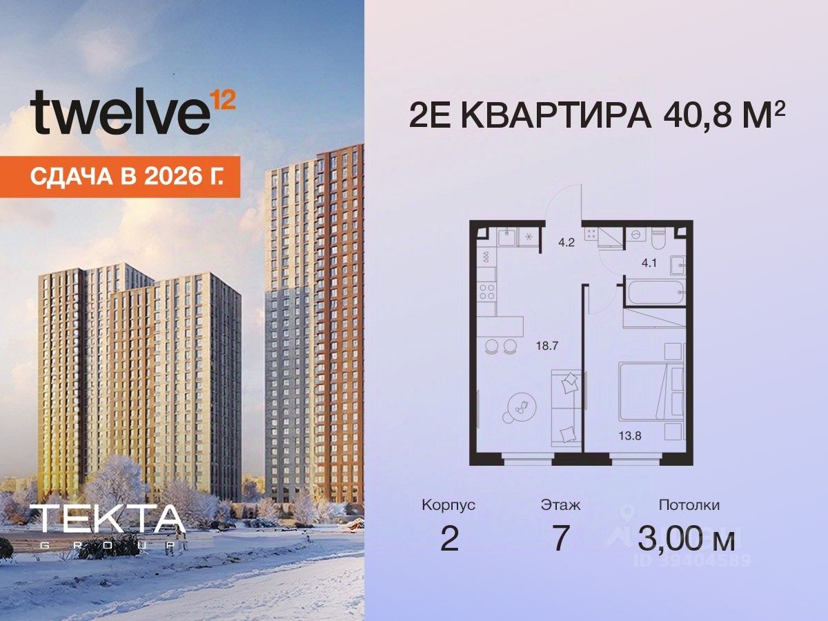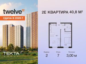 2-комн. квартира в ЖК "Твелв" на 7 этаже в 22 этажном здании Корпус 2. Общая площадь: 40.8 кв.м., жилая: 23.50 кв.м. Высота потолков 3.00 м.
