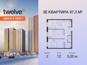 3-комн. квартира в ЖК "Twelve" на 12 этаже в 22 этажном здании Корпус 2. Общая площадь: 67.3 кв.м., жилая: 42.60 кв.м. Высота потолков 3.00 м.