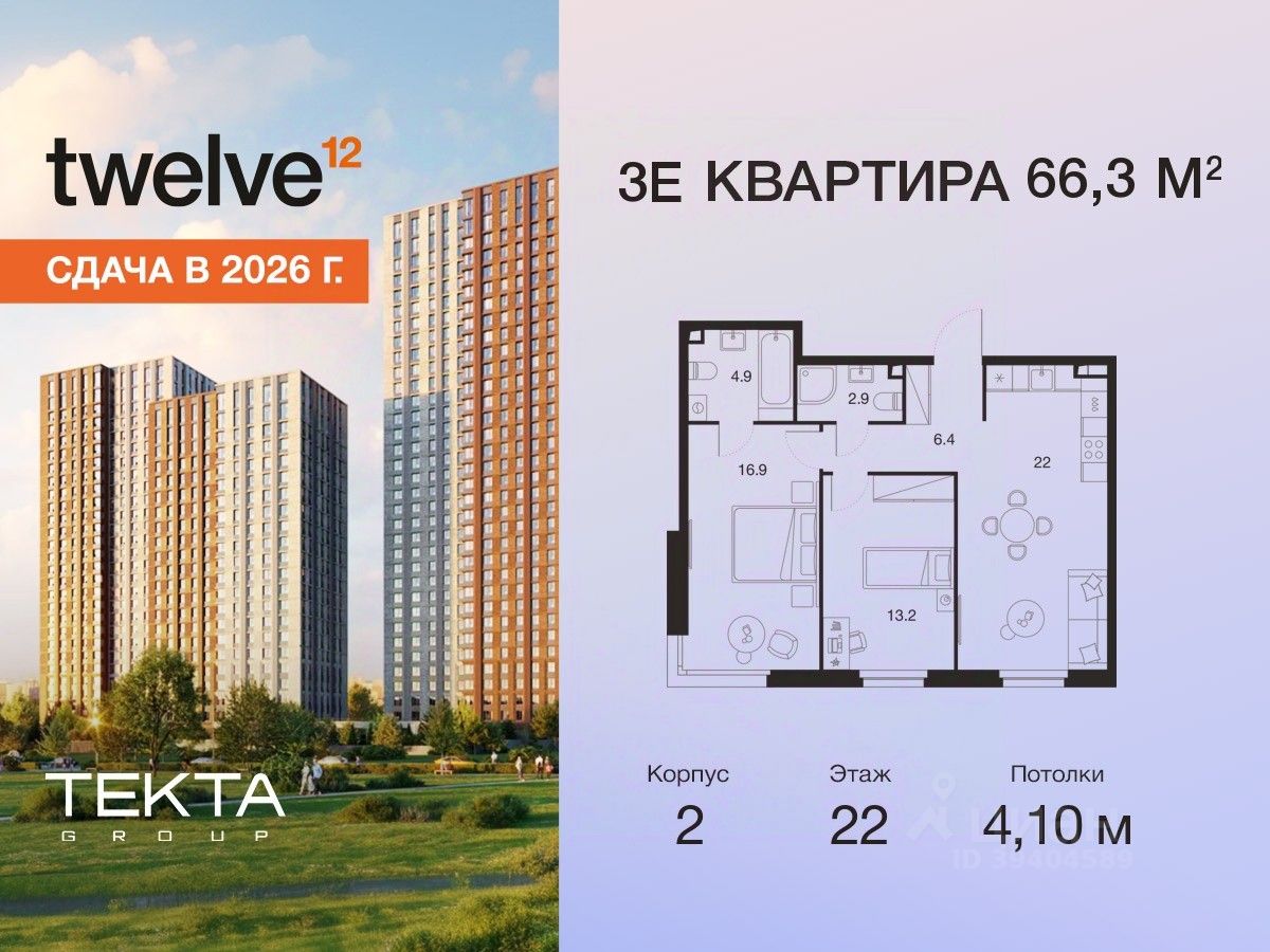 3-комн. квартира в ЖК "Твелв" на 22 этаже в 22 этажном здании Корпус 2. Общая площадь: 66.3 кв.м., жилая: 46.90 кв.м. Высота потолков 4.10 м.