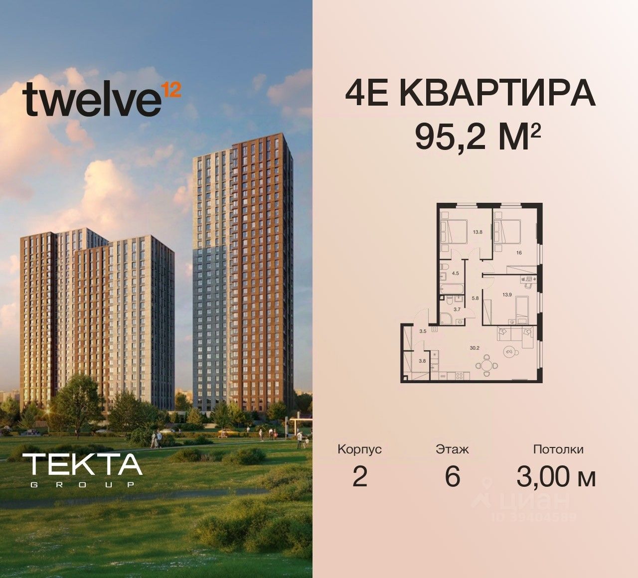 4-комн. квартира в ЖК "Twelve" на 6 этаже в 22 этажном здании Корпус 2. Общая площадь: 95.2 кв.м., жилая: 62.90 кв.м. Высота потолков 3.00 м.